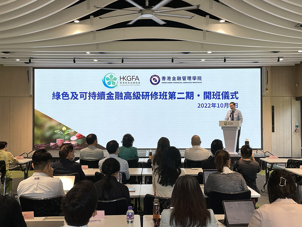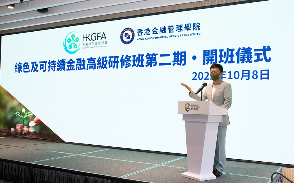 由香港金融管理學院與綠色金融協會共同舉辦的第二期「綠色及可持續金融高級研修班」開班儀式於10月8日上午假香港建造業議會零碳天地舉行。
