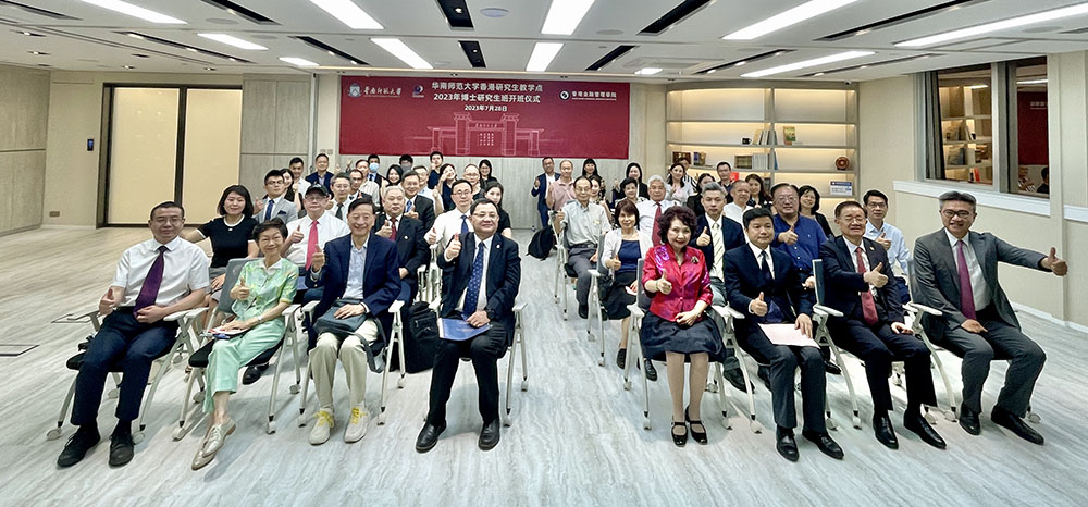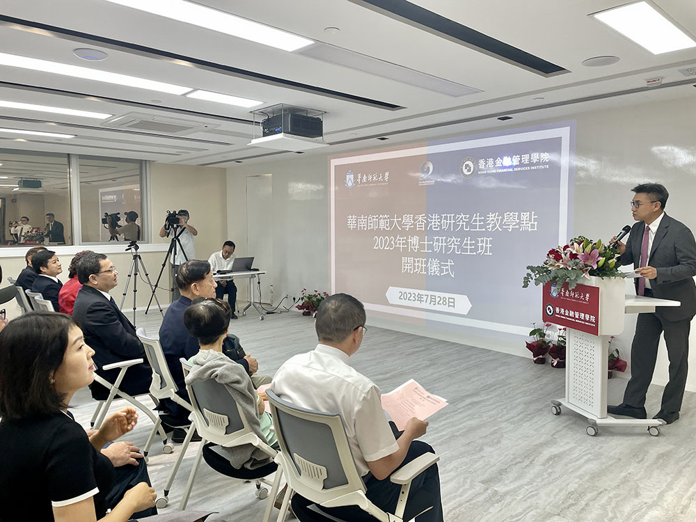 華南師範大學香港研究生教學點于2023年7月28日(週五)在香港金融管理學院上環校址隆重舉行線上和線下開學典禮。華南師範大學校長王恩科、中聯辦教育科技部處長陳玉林和香港金融管理學院董事長王中英等參加了開班儀式。香港金融管理學院院長張奕敏主持了儀式。開班儀式現場。